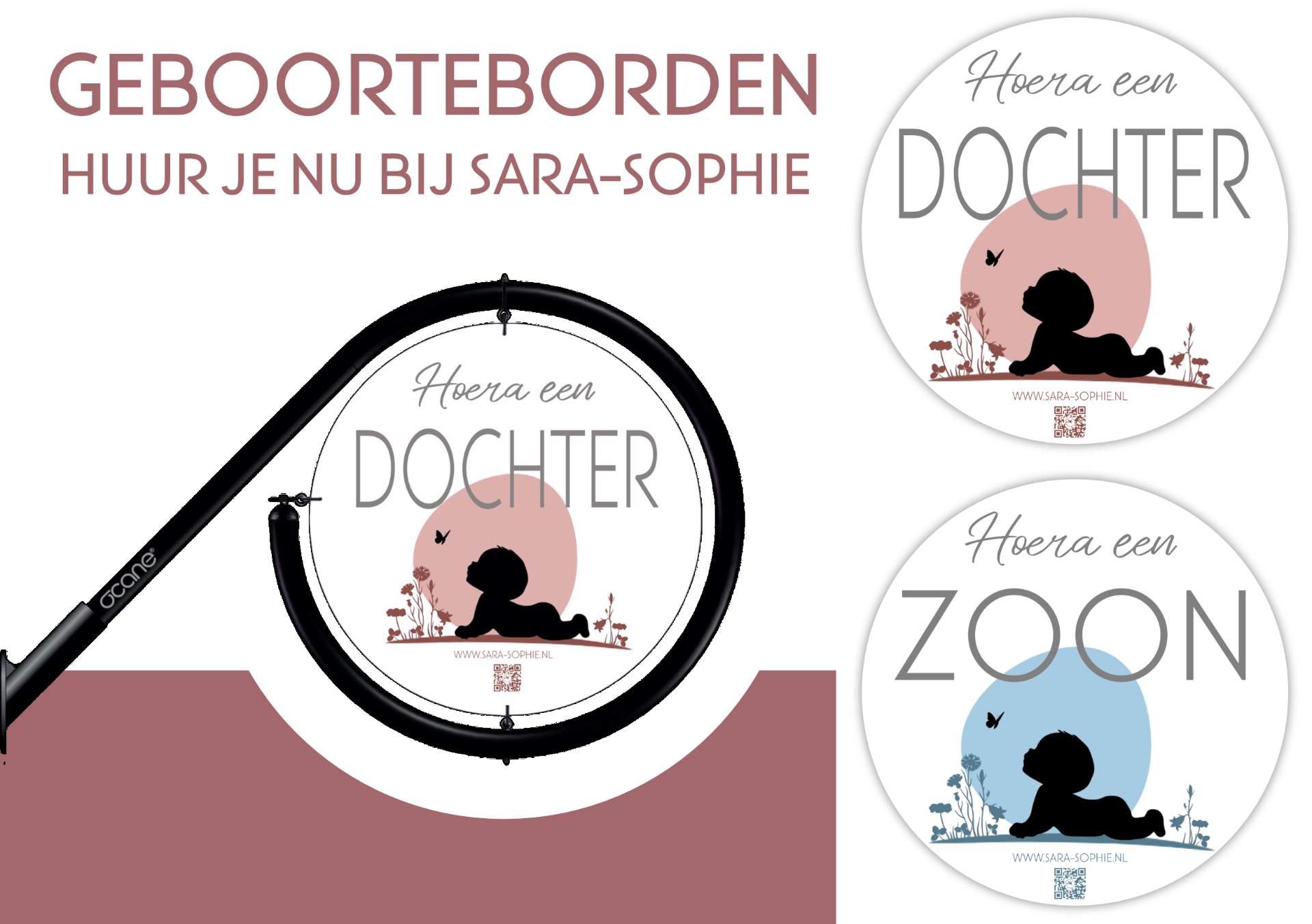Naast de kraamcadeaus kun je bij mij ook geboorteborden huren in vrolijke Sara-Sophie stijl. Ze zijn perfect om op een feestelijke manier de geboorte van je kindje aan te kondigen aan familie, buren en voorbijgangers. De borden zijn eenvoudig te plaatsen in een standaard vlaggenstokhouder en beschikbaar in twee varianten: Dochter en Zoon. Zo deel je het blije nieuws op een originele manier, zonder dat je iets hoeft te bewaren.
