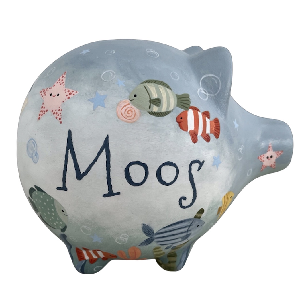 Wat ik er zelf zo leuk aan vind, is dat elk spaarvarken zijn eigen karakter krijgt. Ik schilder ze helemaal met de hand, afgestemd op het geboortekaartje of in overleg met u. Denk aan lieve dieren, zachte kleuren of juist een knallend thema. Zo wordt elk spaarvarken uniek, precies passend bij het kindje voor wie het bedoeld is.
