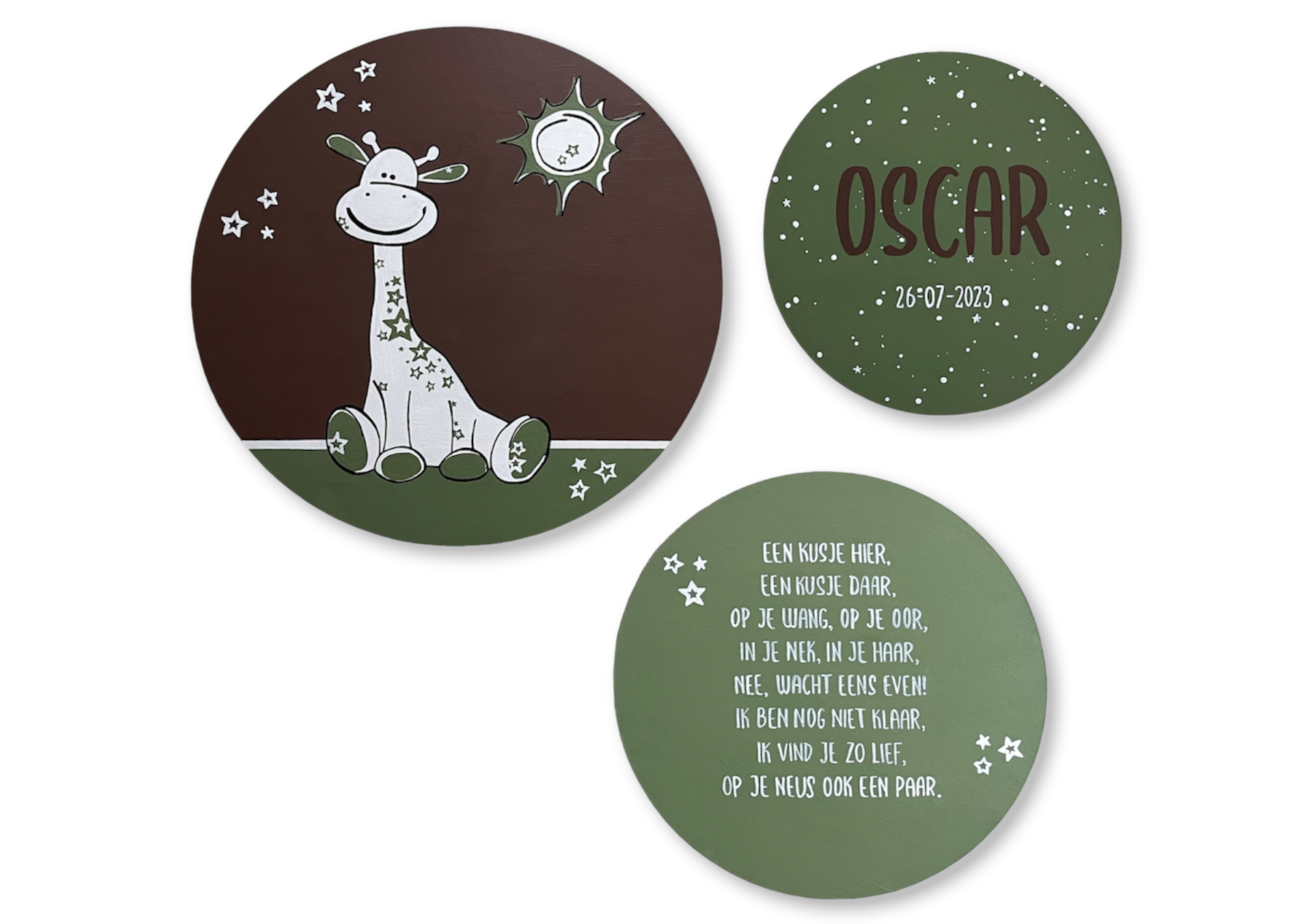 De set bestaat uit drie houten borden in verschillende formaten (ø20 cm, ø25 cm en ø30 cm) die samen een sfeervol drieluik vormen. Perfect om op te hangen boven een wiegje, commode of bedje – en jarenlang een dierbare herinnering aan een bijzonder moment.